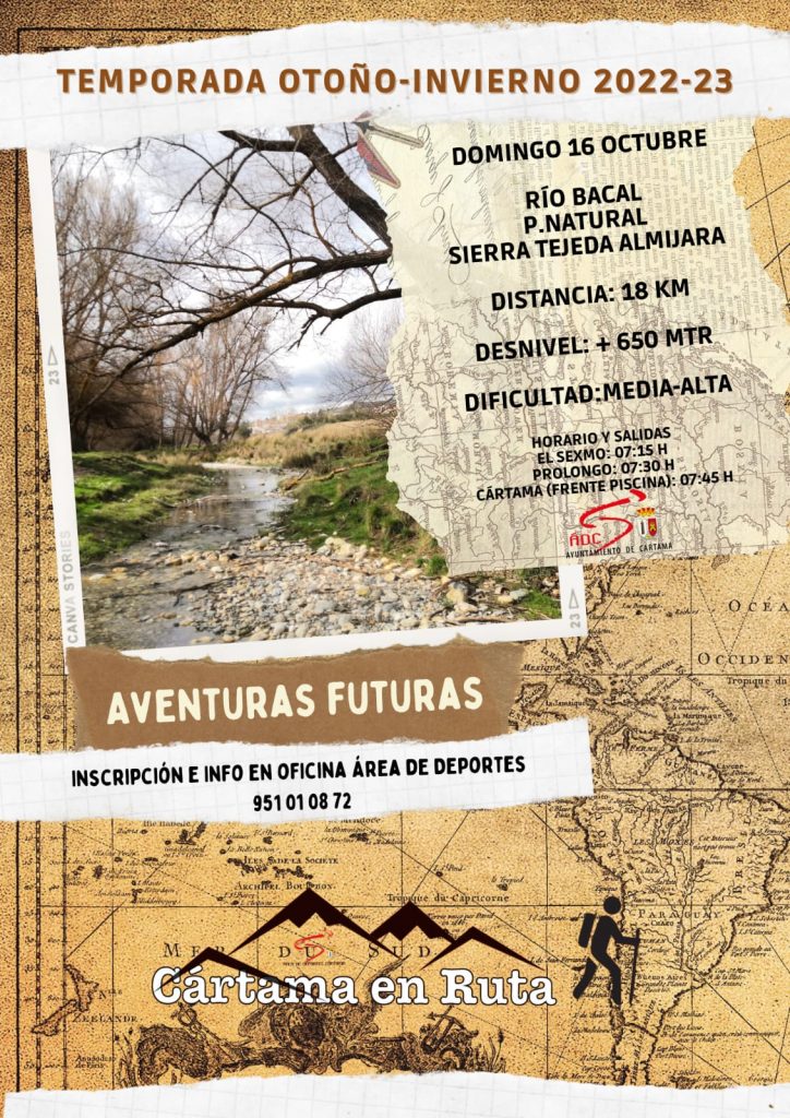 El área de Deportes del Ayuntamiento de Cártama ha organizado una nueva ruta de senderismo dentro de la agenda de rutas de otoño-invierno del programa “Cártama en Ruta”. En esta ocasión, se ha programado un recorrido por el Parque Natural de las Sierras de Tejeda y Almijara, concretamente por el río Bacal. Este evento tendrá lugar el próximo 16 de octubre y el trayecto comprende un recorrido de dificultad media-alta, de 18 kilómetros y de 650 metros de desnivel.