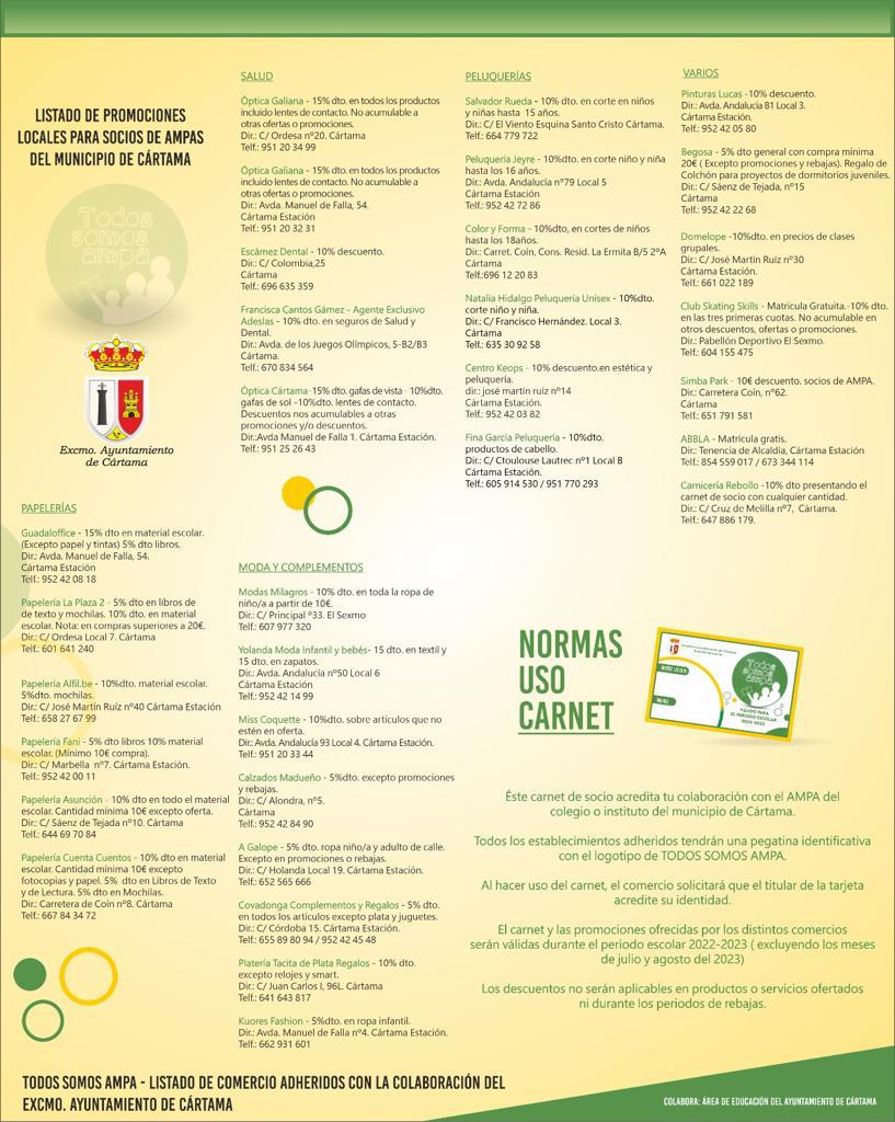 El proyecto Todos Somos AMPA ha puesto en marcha su octava edición y cuenta con la participación de más de 30 comercios del municipio. Esta iniciativa está promovida por las asociaciones de padres y madres de Cártama, junto con el área de Educación del Ayuntamiento de la localidad y su principal finalidad es apoyar a las familias asociadas a estos colectivos a afrontar el gasto económico relacionado con el curso escolar, ofreciendo la posibilidad de beneficiarse de descuentos en los distintos establecimientos del municipio que se han adherido a este proyecto.