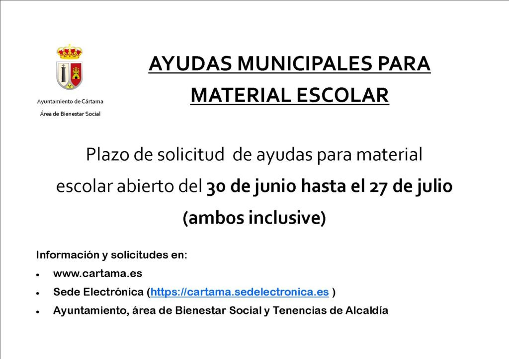 El próximo día 27 de julio se cerrará el plazo de solicitud de las ayudas para la adquisición de material escolar del área de Bienestar Social del Ayuntamiento de Cártama. El objetivo de esta iniciativa es propiciar el sustento de material escolar a aquellas familias más desfavorecidas con el fin de lograr un acceso más óptimo al sistema educativo, así como erradicar, en la medida de lo posible, el absentismo y el fracaso escolar.