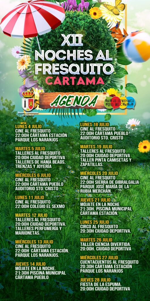 La primera de las actividades que se realizará será Cine al Fresquito, programado para el día 4 de julio, a las 22.00 horas, en el parque de Los Naranjos de Estación de Cártama. Posteriormente, el martes, 5 de julio, habrá Talleres al Fresquito en la Ciudad Deportiva, a partir de las 20.00 horas. Los talleres que se realizarán serán hama beads, trenzas y joyería. Para participar en esta actividad es necesario inscribirse previamente en el área de Juventud, Infancia y Deportes, situada en la Ciudad Deportiva, o llamando al teléfono 951 01 08 72.