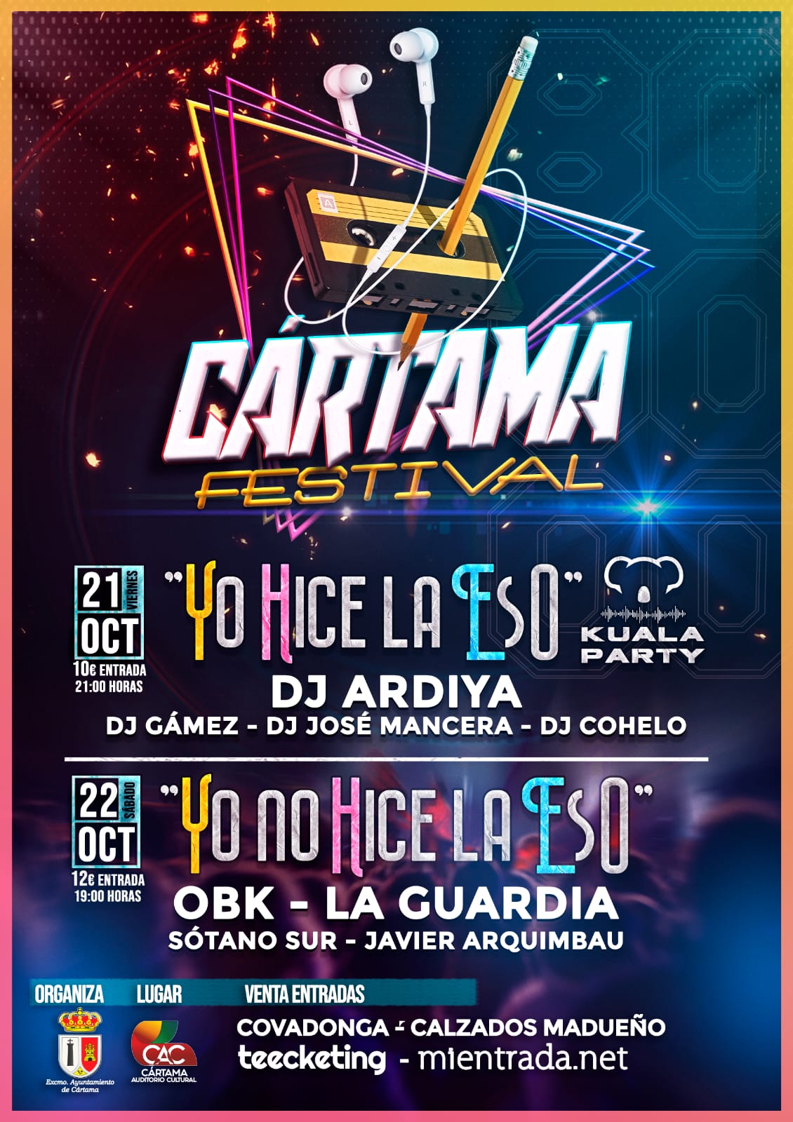 El evento se estructurará en dos conciertos. Por un lado, el día 21 de octubre, a partir de las 21.00 horas, tendrá lugar el concierto “Yo hice la ESO”, donde actuarán DJ Ardiya, DJ Gámez, DJ José Mancera y DJ Cohelo y también habrá una fiesta “Kuala Party” con animación y regalos. Por otra parte, el día 22 de octubre, a las 19.00 horas, será el turno del concierto “Yo no hice la ESO”, con actuaciones de OBK, La Guardia, Sótano Sur y Javier Arquimbau.