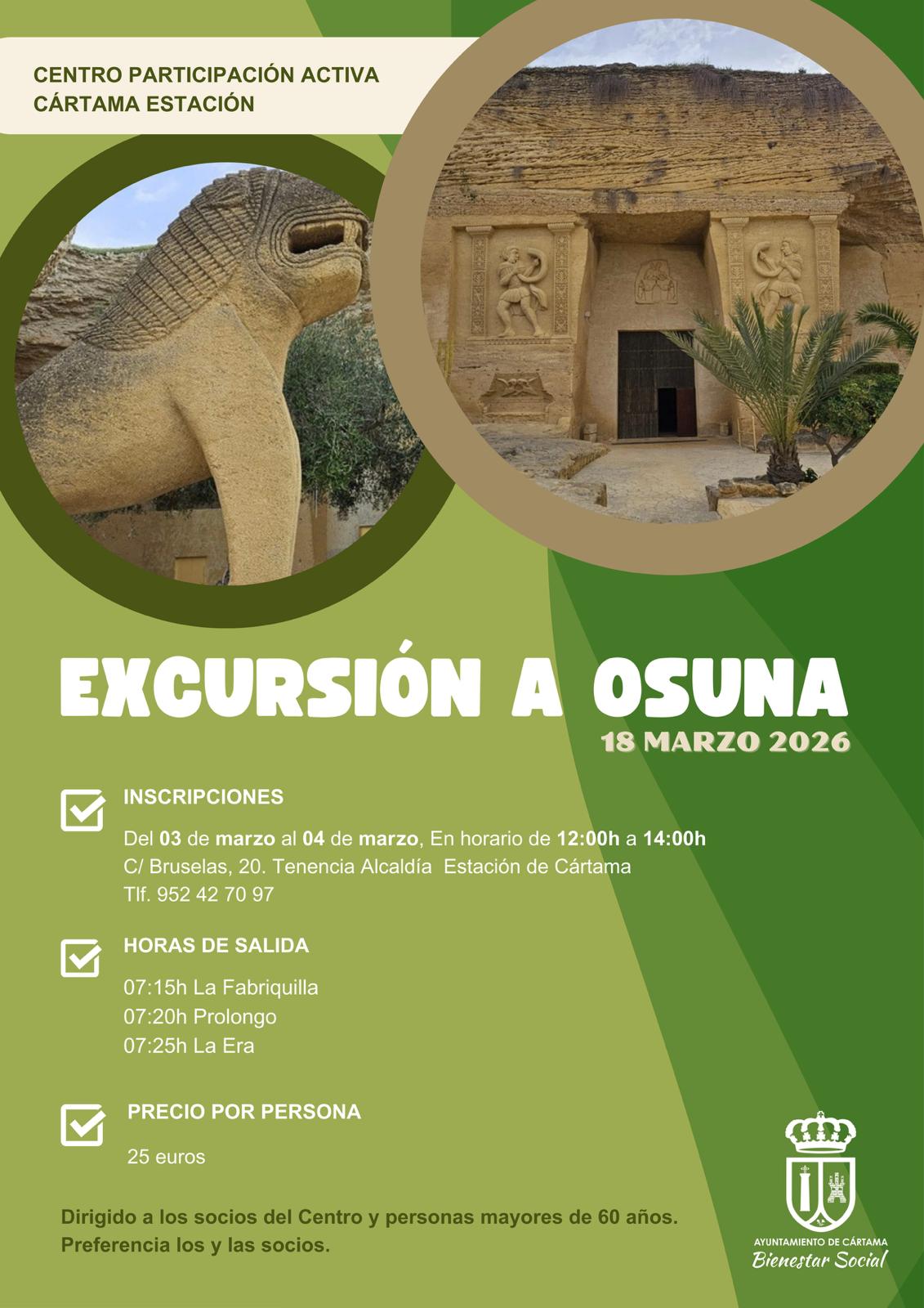 El área de Bienestar Social del Ayuntamiento de Cártama ha organizado una visita a Osuna dirigida a las personas mayores del Centro de Participación Activa de Estación de Cártama. Esta actividad tendrá lugar el próximo 18 de marzo.