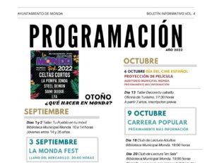 Programación para los meses de Septiembre y Octubre Monda Ya tenemos la nueva programación para los meses de Septiembre y Octubre, cargada de actividades culturales, exposiciones, nuestra carrera popular y