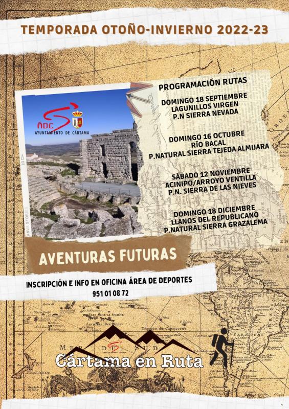 Ya están abierto los plazos de inscripción para esta iniciativa que pone en marcha una vez más el Área de Deportes de Cártama para esta temporada de otoño-invierno. Tendrá un coste de 15€ e incluye la excursión, monitores titulados, transporte y seguro. Las plazas son limitadas y las inscripciones se podrán realizar hasta el viernes anterior a la fecha de la ruta o una vez completado el cupo. Se podrá llevar a cabo en la oficina del propio Área de Deportes situada en la Ciudad Deportiva o puede llamar para más información al 951 01 08 72.