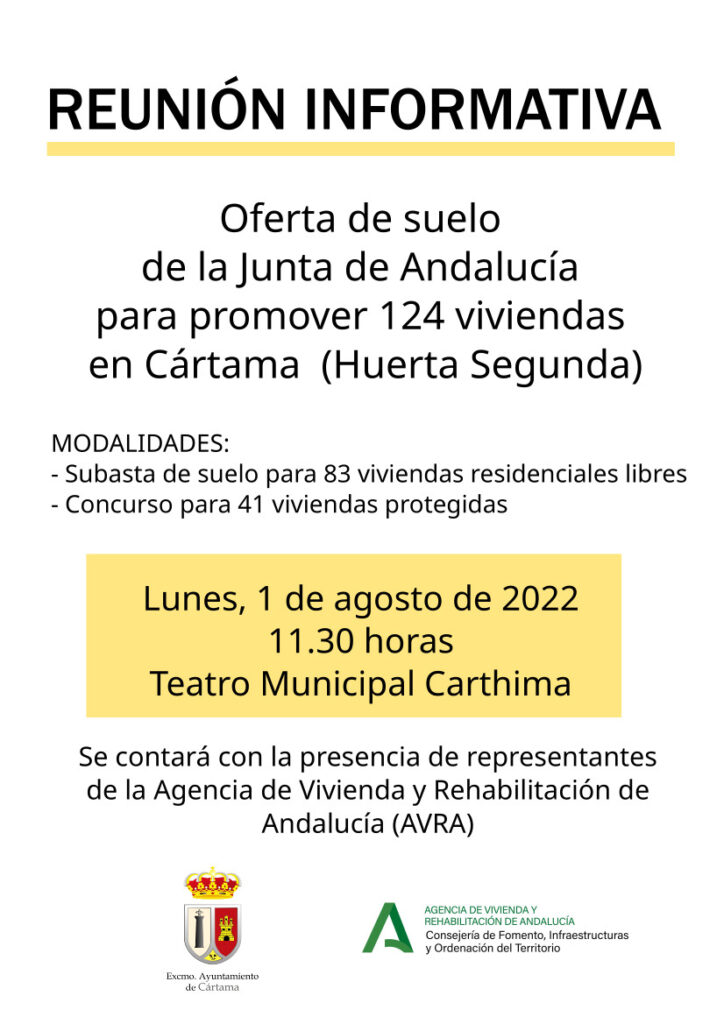 El próximo lunes, 1 de agosto, a las 11.30 horas, en el Salón de Plenos del Ayuntamiento de Cártama (situado en el Teatro Carthima), tendrá lugar una reunión informativa para todas aquellas personas interesadas en la oferta de suelo de la Agencia de Vivienda y Rehabilitación de Andalucía (AVRA) para promover 124