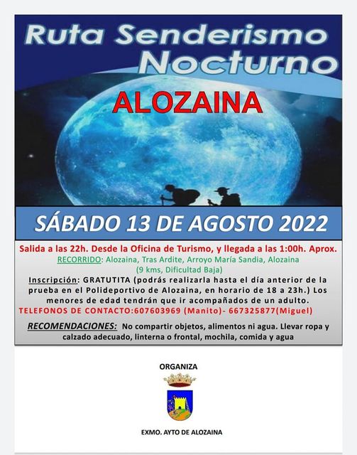 La salida está programada para las 22:00 horas y el lugar de quedada está situado en la Oficina de Turismo de Alozaina, junto al arco de Calle Calvario. Se prevé que la hora de regreso y finalización de la misma será en torno a las 01:00 horas.